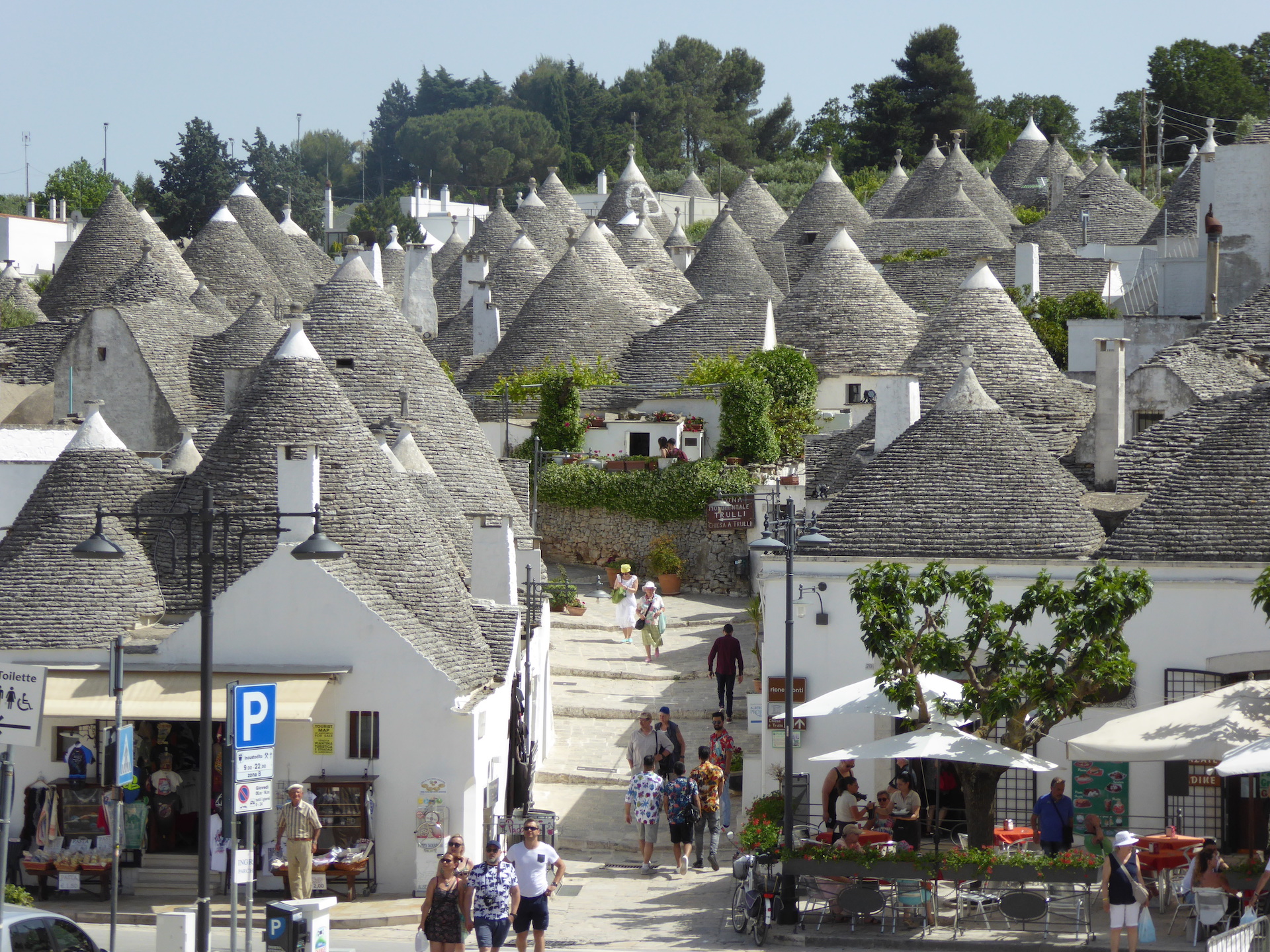 Następnym miejscem, które odwiedziłyśmy, było położone 16 km dalej Alberobello. To niezwykłe miasteczko, którego centrum zbudowane prawie w całości w stylu unikalnym dla tego regionu Apulii, nazywanym trulli. To rustykalne, okrągłe domy, zwieńczone stożkowatymi dachami w kształcie tipi, wewnątrz sklepione kopulasto, zbudowane z wapieni ułożonych bez zaprawy. Ich ściany są zazwyczaj białe, a dachówki w kolorze naturalnym, czasem z namalowanymi symbolami religijnymi bądź ludowymi. Wewnątrz, trulli składają się z wnęk o nieregularnych kształtach, z paleniskiem zapewniającym ciepło zimą, podczas gdy kamienne ściany dają chłód latem. Pojedyncze, często zupełnie szare kamienne trulli, można spotkać w całej okolicy, pełnej gajów oliwnych i migdałowych. Ale w samym Alberobello jest ich ponad tysiąc, przez co miasteczko zostało wpisane na listę UNESCO. Nie wiadomo, jak powstały te budynki, ale ich nazwa oznacza starożytne okrągłe groby, występujące w różnych częściach Włoch. Najstarsze pochodzą z XII w.