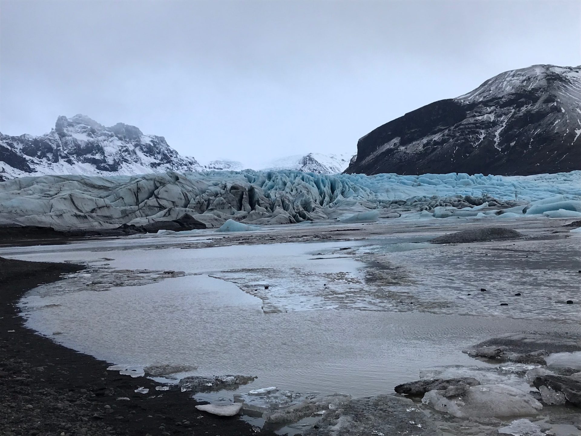 Po południu dotarłyśmy do parku narodowego Vatnajökul. Ogromne języki lodowca widać już z daleka, z drogi nr 1. Zaparkowałyśmy przy Visitors’ Centre i wybrałyśmy krótszą z dwóch tras prowadzących do lodowca. Na szczęście pogoda się poprawiła, przestało wiać i padać. Po około 20 minutach dotarłyśmy do błękitnego lodowca, leżącego przy ogromnej plaży. Między lodowcem a piaskiem jest jezioro z niewielkimi górami lodowymi.