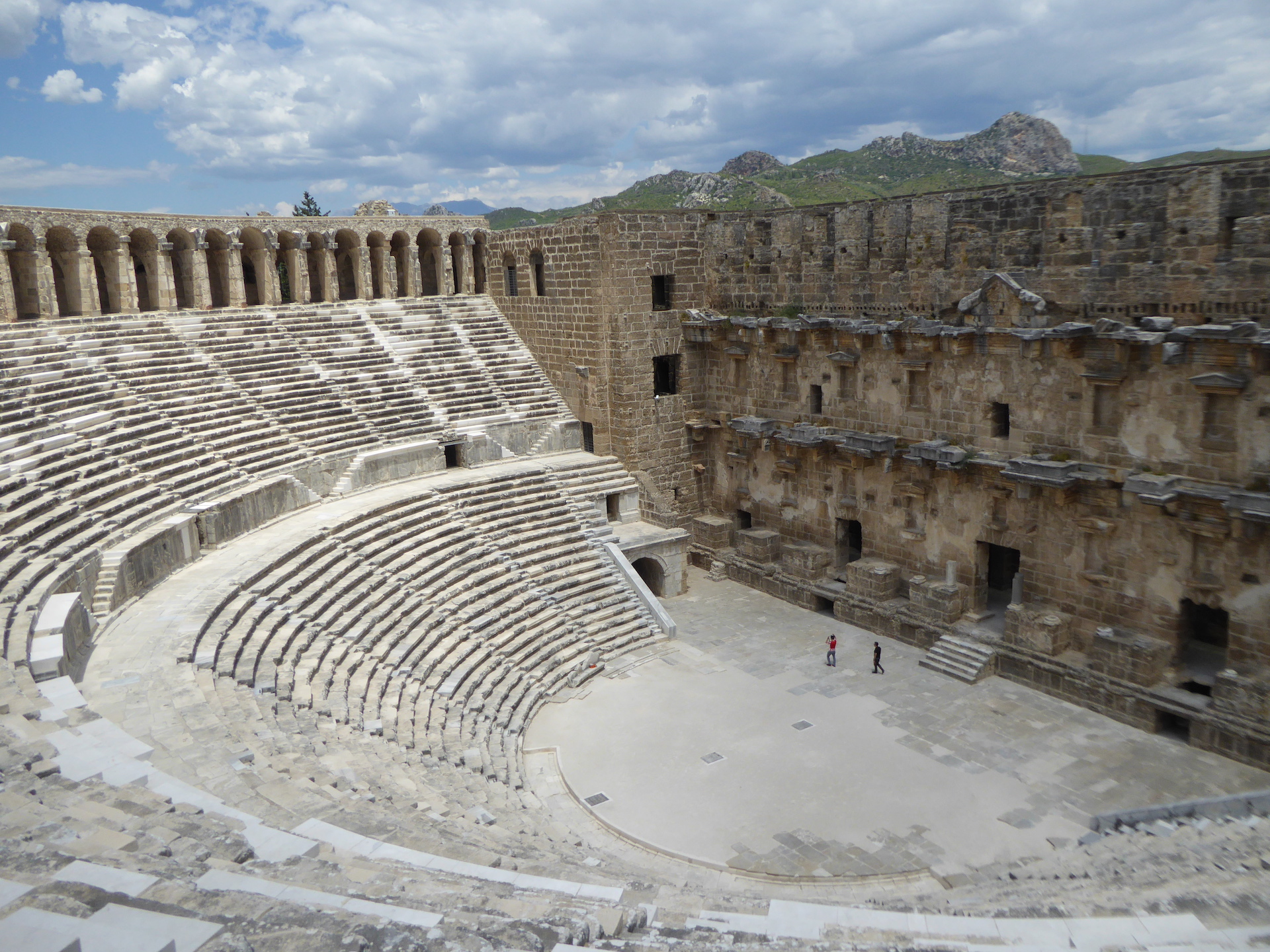 Kolejne pozostałości z czasów antycznych znajdziemy w Aspendos. Miasto zostało założone przez Greków tysiąc lat p.n.e. Stoi tam odrestaurowany amfiteatr na 15 tysięcy miejsc oraz pozostałości akweduktów, stadionu, bazyliki czy agory. Amfiteatr, charakteryzujący się niezwykłą akustyką, w dalszym ciągu wykorzystywany jest do przedstawień w trakcie corocznego Międzynarodowego Festiwalu Opery i Baletu. Wstęp, podobnie jak w Perge, kosztuje 42 liry.